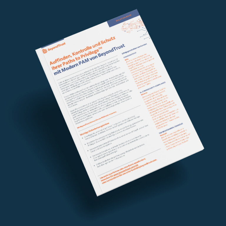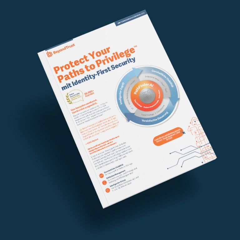 BeyondTrust Intelligenter Identitäts- und Zugriffsschutz KickOff Webinar am 13. Mai 2026 von 10:30 – 11:15 Uhr Anmelden Intelligenter Identitäts- und Zugriffsschutz Mit den Produkten von BeyondTrust werden digitale Identitäten geschützt, Cyberbedrohungen effektiv abgewehrt und sichere, flexible Zugriffskonzepte für moderne Remote-Work-Umgebungen umgesetzt. Nahezu jeder moderne Cyberangriff zielt auf privilegierte Zugänge und Identitäten ab – entweder zur Erlangung des initialen Zugriffs oder zur lateralen Bewegung innerhalb einer IT-Umgebung. Die potenziellen Auswirkungen und Risiken sind dabei größer als je zuvor. Mit den Lösungen von BeyondTrust lassen sich zentrale Anforderungen der Cybersicherheit adressieren – darunter Zero-Trust-Strategien, Schutz vor Ransomware, sicherer Fernzugriff für externe Dienstleister und Mitarbeitende, Cloud-Sicherheit sowie die Einhaltung regulatorischer Compliance- und Cyberversicherungsanforderungen. Lösungen im Überblick Path-finder Identity Security Insights Password Safe Privileged Remote Access Endpoint Privilege Management BeyondTrust Pathfinder Ganzheitliche Plattform für zentralisierte Identitätssicherheit! Pathfinder ist eine vollständig integrierte, KI-gestützte Plattform für Identitätssicherheit, die die Visualisierung, Verwaltung und Governance digitaler Identitäten, Berechtigungen und Zugriffsrechte in einer zentralen Lösung bündelt. Unternehmen erhalten damit eine konsolidierte Übersicht über ihre gesamte Identitäts- und Zugriffsstruktur. Die Plattform ermöglicht die proaktive Identifikation von Transparenzlücken in der Identitätssicherheit sowie eine gezielte und intelligente Reduzierung identitätsbasierter Risiken. Privileged-Access-Management-(PAM)-Kontrollen, einschließlich der konsequenten Durchsetzung des Least-Privilege-Prinzips und kontextbasierter Zugriffsrechte, werden umfassend über alle IT- und Cloud-Umgebungen hinweg angewendet. Mehr erfahren Identity Security Insights Eskalationspfade digitaler Identitäten – auch domänenübergreifend – werden umfassend analysiert und transparent visualisiert. Dadurch entsteht eine vollständige Übersicht über Berechtigungsstrukturen und Zugriffsbeziehungen innerhalb der IT-Umgebung. Die identitätsbasierte Angriffsfläche wird klar nachvollziehbar dargestellt, sodass Risiken frühzeitig erkannt und gezielt kontrolliert werden können. Dies schafft maximale Transparenz und Kontrolle im Bereich der Identitätssicherheit und reduziert potenzielle Sicherheitslücken nachhaltig. Produkt-Highlight: Erkennung von Identitätsbedrohungen Schnellere Prüfung und Reaktion auf Sicherheitsvorfälle Anwendungsfälle Mehr erfahren Password Safe Ermöglicht die zentrale Verwaltung von privilegierten Passwörtern, Konten, Schlüsseln, Secrets und Sitzungen für Personen und Maschinen. Darüber hinaus werden nicht privilegierte Mitarbeiterpasswörter für Geschäftsanwendungen sicher abgesichert, um den Schutz von Zugriffs- und Identitätsdaten zu gewährleisten. Produkt-Highlight: Smarte Automatisierung Schneller ROI Zero-Trust-Enklave und -Architektur Leistungsstarke Integrationen Einfachere Einhaltung von Vorschriften Gesicherte Geschäftskonten für Mitarbeiter Anwendungsfälle Mehr erfahren Privileged Remote Access Best Practices für sicheren privilegierten Zugriff werden erweitert, indem der privilegierte Fernzugriff von Mitarbeitern, Anbietern, Entwicklern und Cloud-Ops-Ingenieuren granular kontrolliert, verwaltet und überprüft wird. Dadurch entsteht eine präzise Zugriffskontrolle, die Sicherheits- und Compliance-Anforderungen unterstützt. Produkt-Highlight: Konsolidierte Zugangswege Vereinfachte Onboarding-Abläufe Cloud-Zugang mit einem Klick Sitzungsüberwachung, Verwaltung und Auditierung Privileged Password Vaulting & Credential Injection Anwendungsfälle Mehr erfahren Endpoint Privilege Management Das Least-Privilege-Prinzip wird durchgesetzt, um Malware, Ransomware und identitätsbasierte Angriffe zu verhindern. Gleichzeitig wird die Konformität über Endpunkte mit Windows-, macOS- und Linux-Systemen gewährleistet und die Zero-Trust-Strategie unterstützt – ohne Einbußen bei der Produktivität. Produkt-Highlight: Qualifikation für Cyberversicherung Schutz vor externen Bedrohungen Schutz vor internen Bedrohungen Verbesserte betriebliche Effizienz Anwendungsfälle Mehr erfahren Entitle PASM Remote Support Software AD Bridge Entitle Entitle ermöglicht eine nahtlose Mitarbeiteranbindung durch granularen Just-in-Time-Zugriff auf Cloud- und SaaS-Infrastrukturen. Dadurch wird eine kontrollierte und bedarfsgerechte Zugriffserteilung gewährleistet, die Sicherheits- und Compliance-Anforderungen unterstützt. Produkt-Highlight: Gewinner der SC Awards 2024 Skalierung von Just-in-Time-Zugriff Notfallzugang SIEM-Warnungen bei privilegierten Zugriffen Verbesserte Sichtbarkeit von Berechtigungen Automatisierung von Zugriffsprüfungen Anwendungsfälle Mehr erfahren Endpoint Privilege Management Total PASM kombiniert die leistungsstarken Funktionen von Privileged Account and Session Management (PASM). Durch die Zusammenführung von Password Safe und Privileged Remote Access entsteht eine integrierte Lösung! Password Safe Automatisierung von Privileged Asset Discovery und Onboarding. Verwaltung von privilegierten Passwörtern, DevOps-Secrets, SSH-Schlüssel und mehr. Privileged Remote Access Erstklassige Sitzungsverwaltung für jedes Betriebssystem, überall. Erweitern Sie PAM-Best-Practices auf Remote-Mitarbeiter und -Drittanbieter. Funktionsüberblick: Verwaltung aller privilegierten Konten und Sitzungen Erfassung und Onboarding aller privilegierten Konten Sicherer Remote-Zugriff für Drittanbieter und Mitarbeiter Implementierung von Real-Time Session Management Erfüllung von Compliance- und Audit-Anforderungen Vereinfachter Zugriff auf Cloud-Infrastrukturen Anwendungsfälle Mehr erfahren Remote Support Software Der Servicedesk wird durch sicheren Remote-