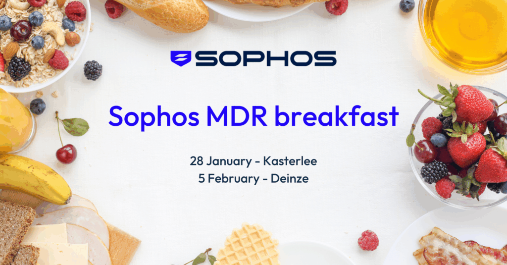 Sophos MDR breakfast session 28 Jan 2026 - 5 Feb 2026 • 8:00 am - 11:00 am What? Breakfast, XDR & Better ROIKick off your day with practical insights into XDR management and discover how MDR saves time while improving security outcomes. Price: Free Roadshow schedule 28/01 – Kasterlee Corsendonk Hooge HeydeSteenfortstraat 52460 Kasterlee 05/02 – Deinze Kasteel OoidonkOoidonkdreef 99800 Deinze Agenda 8h00: arrival with breakfast 8h30: welcome 9h00: Let’s talk MDR 10h00: Demo & networking 11h00: End Register Where will you join us? Click on your location below & register now! 28 January – Kasterlee 5 February – Deinze