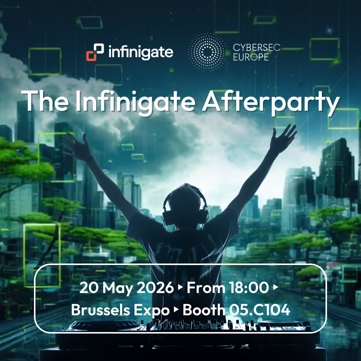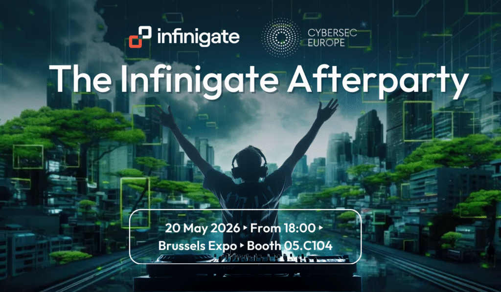 The Infinigate Afterparty @ Cybersec Europe 20 May 2026 • 6:00 pm - 10:00 pm Brussels Expo As every year, Infinigate Belgium is excited to be back at Cybersec Europe! After a full first day at the event, why rush off somewhere else? On May 20, we’re hosting an afterparty right at our booth. Expect a DJ, food and drinks. Oh and of course, great company! No taxis, no hunting for the next place. Just stay where you are, chillax, and enjoy the evening. Come by booth 05.C104 and let’s turn the end of day one into a proper night out. 🍸 Practical info Date: 20 May 2026 Time: From 18:00 Location: Cybersec Europe – Brussels Expo (Belgiëplein 1, 1020 Brussels) Booth 05.C104 Who should attend? Everyone is welcome to join us! Register Note: Registration for our afterparty does not grant you access to the trade fair.