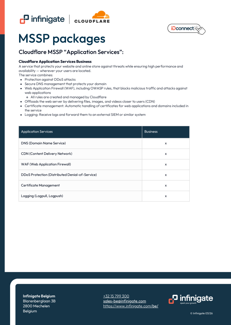 Cloudflare Fast onboarding. Smart security. You can now offer Cloudflare Application Security and Zero Trust (SASE) as a service. With a fixed price list and clear packages, it becomes easy to plan, sell, and deliver Cloudflare to your customers. You get up and running quickly and only pay for the licenses that are actually in use, based on your customers’ needs. Cloudflare’s platform brings together customers, licenses, and active services in one place, giving you full visibility and making it easy to onboard, configure, and manage your customers. To become an MSSP, both sales and technical certifications are required. This ensures that you have the right expertise to answer basic questions and support your customers when needed. Infinigate supports you as an MSSP with Level 1 and Level 2 support. For more advanced cases, Cloudflare is involved. All support is provided in English. Why choose Cloudflare MSSP? Pay only for what you sellInfinigate provides monthly invoicing based on the actual number of active users. Sell without riskNo lock-in period. Scale up, scale down, or pause according to your customers’ needs. Upsell opportunitiesAs an MSSP, you get access to a broad range of Cloudflare products and Zero Trust solutions. Full control over the customer journeyAs a certified MSSP, you handle onboarding yourself, which creates closer customer relationships and greater upselling opportunities. Support from Infinigate and CloudflareDISTRI MSSP = L3 Handling complex incidents escalated by the MSSP (L1/L2). Deep analysis and resolution of technical issues requiring advanced expertise. Coordinating with Cloudflare if further escalation is needed MSSP Partner = L3 Escalating unresolved issues to VAD (L3) Initial triage and basic troubleshooting Responding to and managing alerts, incidents, and issues raised by customers Full visibility of marginsA transparent and fixed price list makes it easy to set the right price and ensure profitability. MSSP package Q&A How do you become an MSSP partner with Cloudflare? Resellers can easily apply to become an MSSP partner. Contact us and we will guide you through the next steps. What certifications are required? The company must have at least two people with both a technical certification and a sales certification. What investment is required? No investment or minimum order is required. How do I contact support for Level 3? L3 support is handled by Infinigate between 08:00–17:00. Register your case here in English. Outside business hours, the case is registered directly in the Cloudflare partner portal. How often are licenses invoiced? MSSP partners are invoiced monthly based on actual usage. What Cloudflare solutions can I sell as an MSSP? Application Security and Zero Trust (SASE). See the PDF for details about the packages. Is there a platform for managing MSSP customers? Yes, in the Cloudflare platform you can add, manage, and remove customers and products. Contact us — and we’ll help you get started! Contact us