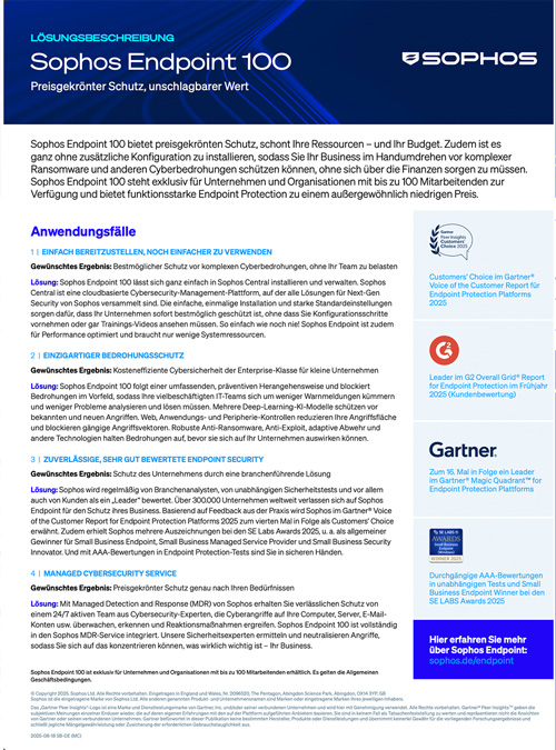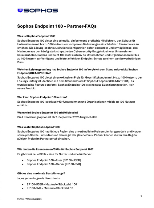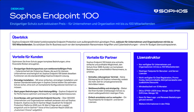 Neues Sophos Endpoint-Angebot Webinar vom 28.10.2025 Haben Sie das Webinar verpasst? Hier können Sie die Aufzeichnung anschauen und die Präsentation als PDF herunterladen. Die Präsentation und weitere Unterlagen als PDF herunterladen. PPT «Neues Sophos Endpoint-Angebot» Download DESKAID Download Partner FAQ Download Lösungsbeschreibung Download