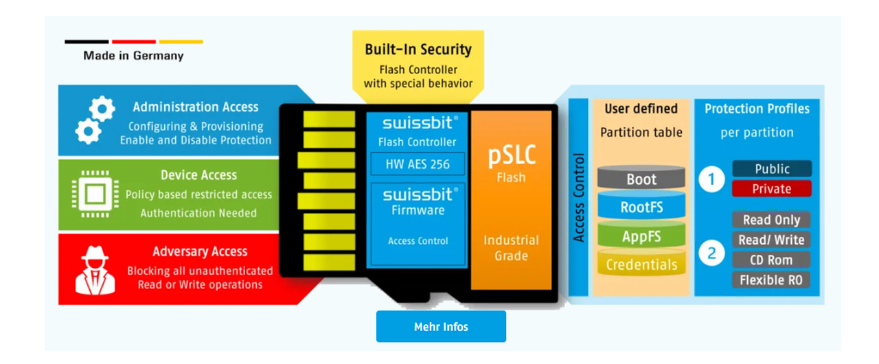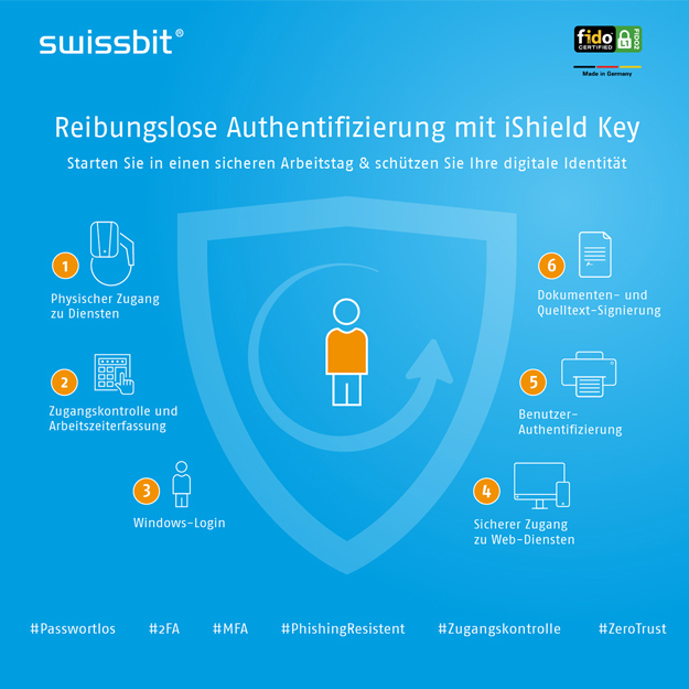 Swissbit Swissbit bietet hardwarebasierte Security-Produkte an, mit denen Unternehmen Daten oder Identitäten sichern und Zero-Trust-Umgebungen realisieren können. iShield KeySecurity Upgrade KitTrainingsPartner werdenKontakt Die Swissbit AG ist das führende europäische Technologieunternehmen für Speicherlösungen und Sicherheitsprodukte. Die Vision von Swissbit ist eine vernetzte Welt, in der Daten und digitale Identitäten jederzeit vertrauenswürdig sind – als Grundlage für echte digitale Souveränität. Swissbit entwickelt und produziert innovative Lösungen für Datenspeicherung, Datenschutz und den Schutz digitaler Identitäten. Dabei kombiniert das Unternehmen seine einzigartigen Kompetenzen in Hardware- und Firmware-Entwicklung mit umfassendem Advanced-Packaging-Know-how. Die Lösungen kommen in zahlreichen Branchen zum Einsatz, darunter Industrieautomation, Netzwerk- und Kommunikationstechnologien, Edge Computing, Transportwesen, kritische Infrastrukturen, Verteidigung sowie im öffentlichen Sektor. Gegründet im Jahr 2001, verfügt Swissbit über Niederlassungen in der Schweiz (Hauptsitz), Deutschland, den USA, Japan und Taiwan. Die hochmoderne Elektronikfertigung am Standort Berlin unterstreicht die technologische Kompetenz und Innovationskraft des Unternehmens. Video: Swissbit iShield Key Pro Digitale Identitäten wirksam schützen – mit FIDO Hardware Security Keys von Swissbit Wie lassen sich digitale Identitäten heute effektiv absichern? Und wie gelingt es Unternehmen, mit FIDO-zertifizierten Hardware Security Keys die digitale und physische Zugangskontrolle sowie die Authentifizierung auf ein neues Niveau zu heben? Alexander Summerer, Head of Authentication bei Swissbit, gibt in einem praxisorientierten Webinar Einblicke in die Lösungen von Swissbit. Als Hersteller mit eigener Produktion in Berlin („Made in Germany“) und einer sicheren Supply Chain nimmt Swissbit eine einzigartige Position im Markt ein. Lernen Sie Swissbit und die iShield Key-Reihe kennen! Hier geht’s zum Video Produktlösung: iShield Key Die iShield Key 2 Serie ist ein neuer Hardware-Sicherheitsschlüssel für die sichere passwortlose, phishing-resistente Authentifizierung und den Schutz von Online-Konten. Er integriert zum ersten Mal den FIDO-Standard mit der NFC-basierten MIFARE DESFire EV3-Technologie. Diese einzigartige Kombination ermöglicht zusätzliche Funktionalitäten wie Zugangskontrolle, Zeiterfassung und Zahlungsabwicklung. Darüber hinaus bietet es den bestmöglichen Schutz für Online-Konten und ermöglicht einen sicheren Zugang zu Websites, Anwendungen, Diensten und Unternehmensnetzwerken. 90% der Internetnutzer sind besorgt darüber, dass Hacker ihre Passwörter stehlen könnten. Durchaus berechtigt, denn kompromittierte Zugangsdaten sind die häufigste Ursache für böswillige Angriffe und für 61% aller Sicherheitsvorfälle verantwortlich. Die iShield Key-Serie von Swissbit bietet die stärkste Hardware-Authentifizierungsmöglichkeit. Benutzer können sich einfach, sicher und flexibel vor Online-Angriffen wie Phishing, Social Engineering und Kontoübernahmen schützen. Mehr erfahren How to use Videos Verwaltung iShield Key2 Registrierung und Anmeldung iShield Key2 iShield Key Der iShield Key 2 ist ein grundlegendes Element einer Zero-Trust-Strategie, das die Implementierung von MFA und die Einhaltung gesetzlicher Vorschriften wie NIS2, CRA, DORA und der U.S. Executive Order on cybersecurity erleichtert.Unternehmen und Institutionen können den Security Key beispielsweise für Zeiterfassung, Micropayment, Treueprogramme, Campus- und Studentenausweise sowie moderne öffentliche Verkehrssysteme einsetzen. Download NIS2 Whitepaper Use Cases zu IT-Sicherheit und Hardware-Schutz Swissbit hat verschiedene Anwendungsfälle im Bereich IT-Sicherheit, Datenschutz und Hardware-Schutz untersucht. Dabei wurden die zentralen Herausforderungen, die passende Swissbit-Lösung sowie die konkreten Vorteile aufgezeigt. Die iShield Key 2 Broschüre und die detaillierte Use Case Analyse zum Thema USB-Security Key stehen zum Download bereit. Downloads Broschüre (EN) Finanzsektor Gesundheitswesen Fertigungsindustrie Flughäfen Fluglinien Produktlösung: Security Upgrade Kit (SUK) Cyberangriffe betreffen zunehmend auch Embedded-Systeme. Deren Design und lange Lebenszyklen bringen besondere Sicherheitsanforderungen mit sich. Regulierungsbehörden weltweit reagieren mit Vorschriften wie der anstehenden Radio Equipment Initiative (RED) oder dem Cyber Resilience Act ab 2027 auf die wachsende Bedrohungslage. Mit dem Security Upgrade Kit bietet Swissbit eine benutzerfreundliche und sichere Lösung, die sowohl den Schutz von Embedded-Systemen als auch die Einhaltung relevanter Cyber-Sicherheitsvorgaben ermöglicht. Das Kit umfasst eine microSD-Karte in Industriequalität sowie passende Dokumentation, Software und Tools. Es umfasst Hardware-basierte Zugriffskontrolle, Echtzeit-Datenverschlüsselung mit AES 256 und erlaubt die individuelle Anpassung von Schutzprofilen. Anwendungsbereiche sind unter anderem der Kopierschutz sensibler Daten oder der Schutz der Systemintegrität durch Secure Boot. Als Nachrüstlösung auf microSD-Basis bietet das Security Upgrade Kit maximale Flexibilität. Mehr erfahren How to use Videos Produkt Einführung:Security Upgrade Kit Technische Beschreibung:Security Upgrade KIT Security Boot für Raspberry PI Die wichtigsten Vorteile für Swissbit Reseller Partner Rundum-Service von Swissbit im Vertrieb Schnelle Produktverfügbarkeitsprüfung Direkter Kontakt mit erfahrenen Design-, System- und Firmware-Experten Field Application Engineers auf der ganzen Welt vor Ort Produkt-Langlebigkeit bis zu 10 Jahre Produkte und Dienstleistungen mit optimierten Gesamtbetriebskosten An Kosten- und Kundenanforderungen ausgerichtetes Design Made in Germany Warum eine Partnerschaft mit Infinigate und Swissbit? Infinigate bietet die technische Vertriebs- und Lösungserfahrung, die Sie benötige