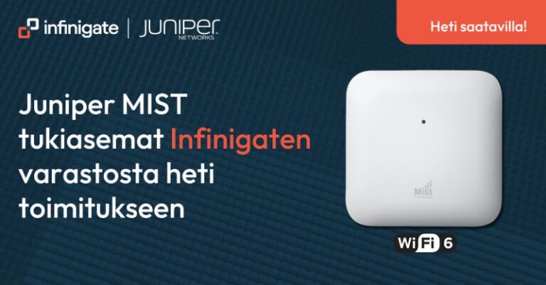 Juniper MIST tukiasemat heti toimitukseen Juniper Mist tukiasemia löytyy Infinigaten varastosta heti toimitettavaksi. Laita meille viestiä ja niin saadaan asiakkaasi wlan ympäristö kuntoon. Kysy lisää