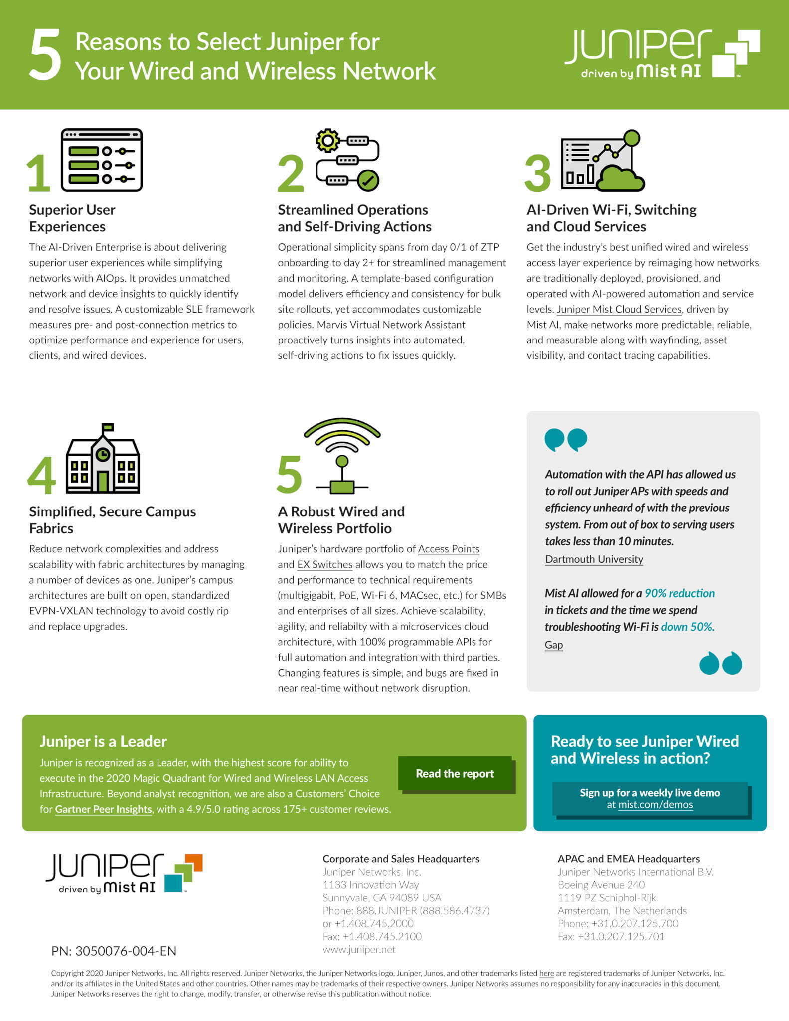 5 syytä valita Juniper MIST Juniper MIST AI & Cloud tarjoaa ainutlaatuisen yhdistelmän verkon näkyvyyttä, yksinkertaistettua hallintaa, ennakoivaa ylläpitoa ja tietoturvaominaisuuksia, mikä tekee siitä ihanteellisen ratkaisun kaikenkokoiselle yrityksille. Lue lisää
