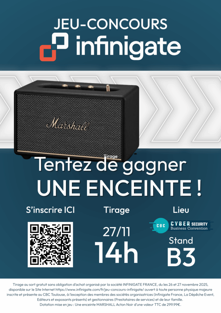Jeu-Concours Infinigate x CBC A l’occasion du CBC, tentez de gagner Une enceinte MARSHALL Acton Noir d’une valeur TTC de 299.99€ ! Tirage au sort gratuit sans obligation d’achat organisé par la société INFINIGATE FRANCE, du les 26 et 27 novembre 2025, ouvert à toute personne physique majeure inscrite et présente au CBC Toulouse, à l’exception des membres des sociétés organisatrices (Infinigate France, La Dépêche Event, Editeurs et exposants présents) et gestionnaires (Prestataires de services) et de leur famille. Dotation mise en jeu : Une enceinte MARSHALL Acton Noir d’une valeur TTC de 299.99€. Veuillez vous inscrire ici : Jeu Concours Infinigate x CBC Veuillez remplir les information ci dessous CommentsCe champ n’est utilisé qu’à des fins de validation et devrait rester inchangé.Nom(Nécessaire) Prénom Nom E-mail(Nécessaire) Téléphone(Nécessaire)Société REGLEMENT COMPLET : TIRAGE AU SORT CBC TOULOUSE Art. 1 La Société Infinigate France, située 40 avenue Pierre Lefaucheux 92100 Boulogne-Billancourt, FRANCE, organise un tirage au sort sis dénommé « Tirage au sort CBC Toulouse » le 27 novembre 2025 lors du salon CBC Toulouse 2025 à 14h00. Art. 2 La participation au « Tirage au sort CBC Toulouse » implique l’acceptation expresse et sans réserve du présent règlement, en toutes ses stipulations, des règles de déontologie en vigueur sur Internet ainsi que des lois et règlements applicables aux « tirages au sort » en vigueur en France. Tout litige concernant son interprétation sera tranché souverainement et sans appel par la société organisatrice. Art. 3 La participation au « Tirage au sort CBC Toulouse » ne doit entraîner aucune violation des directives de conformité applicables de l’entreprise dans laquelle le participant est employé. Art. 4 Le « Tirage au sort CBC Toulouse » s’adresse à tout participant majeur (plus de 18 ans) de passage sur le stand B3 Infinigate France lors du CBC Toulouse à l’exception des membres des sociétés organisatrices (Infinigate France, La Dépêche Event, Editeurs et exposants présents) et gestionnaires (Prestataires de services) et de leur famille. Art. 5 Pour participer, le visiteur du stand devra scanner le QRCode et compléter le formulaire de son nom, prénom, nom de la société qui l’emploie, adresse complète de la société qui l’emploie et sa fonction au sein de celle-ci. Les données collectées sont traitées conformément à la politique de protection des données à caractère personnel mis en place par la société Infinigate France en conformité RGPD. Les participants disposent d’un droit d’accès, de modification, de rectification et de suppression des données les concernant. Art. 6 Pour participer au « Tirage au sort CBC Toulouse, il suffit de : – Se rendre sur le stand B3 Infinigate France – Scanner le QRCode pour compléter le formulaire – Compléter chacun des champs obligatoires du formulaire – Accepter d’être photographié(e) lors de l’événement et accepter que les photos soient communiquées par la société Infinigate dans le cadre d’une communication sur LinkedIn. Art. 7 Une seule participation au « Tirage au sort CBC Toulouse » est autorisée. S’il est constaté qu’une personne s’enregistre plusieurs fois sa participation sera considérée comme nulle. Art. 8 Le lot mis en jeu lors du CBC Toulouse est une enceinte MARSHALL Acton Noir d’une valeur TTC de 299.99€. Le lot sera envoyé à l’adresse indiquée par le participant dans un délai d’1 mois après la date du tirage au sort qui a lieu le 27/11/2025 à 14h00. Art. 9 Le lot offert est nominatif et non-cessible. Le lot ne peut faire, à la demande du gagnant, l’objet d’un remboursement en espèces ou d’une contrepartie de quelque nature que ce soit. L’organisateur pourra, si des circonstances indépendantes de sa volonté constitutives de cas de force majeure l’y obligent, remplacer le lot par un lot de nature et de valeur équivalente. Art. 10 La participation à ce tirage au sort implique l’acceptation pure et simple du présent règlement. Les participants s’interdisent de mettre en œuvre ou de chercher à mettre en œuvre tout procédé de participation qui ne serait pas strictement conforme au respect des principes du tirage au sort et de ce présent règlement. La société Infinigate se réserve également le droit de disqualifier tout participant qui altère le fonctionnement du tirage au sort ou qui viole les règles officielles du tirage au sort. La société Infinigate pourra décider de modifier ou d’annuler ce tirage au sort et d’en modifier ses termes et conditions à tout moment sans préavis.