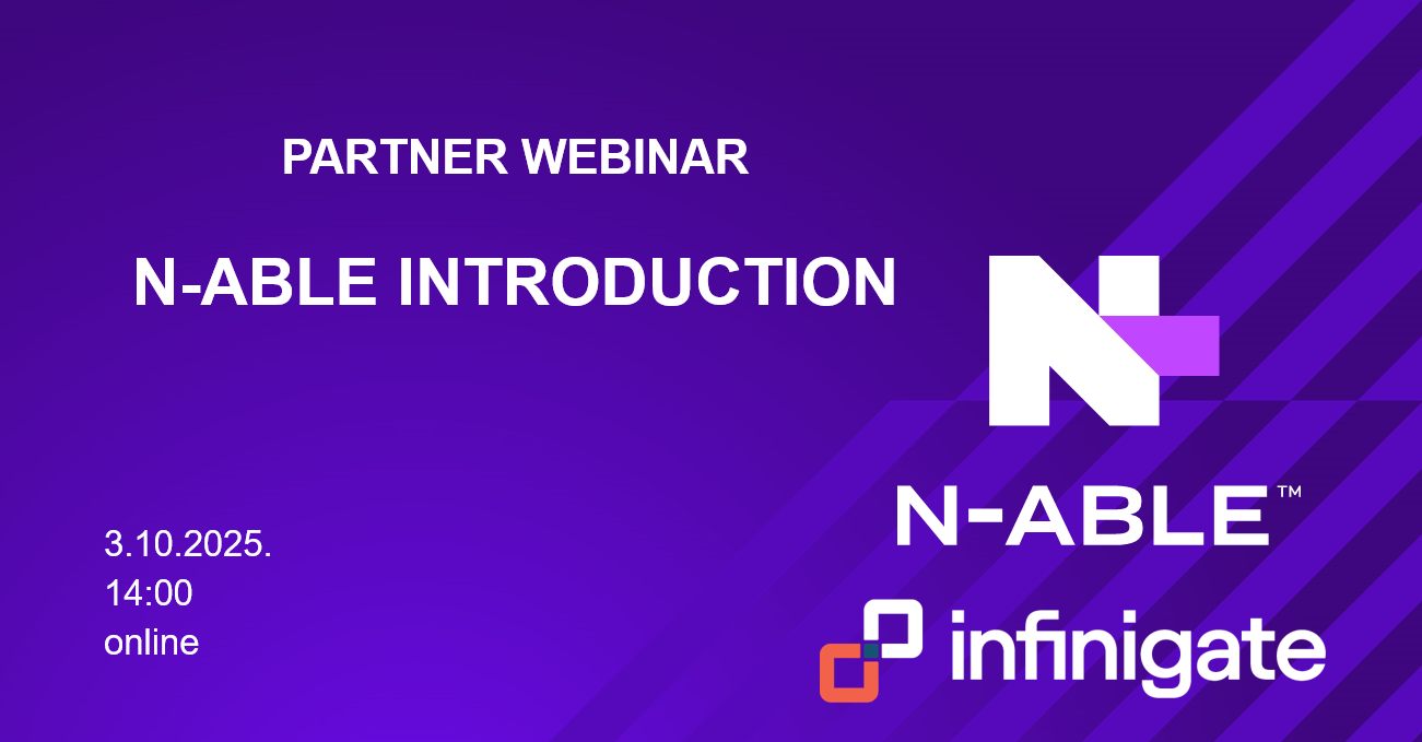 N-ABLE INTRODUCTION PARTNER WEBINAR 03/10/2025 • 14:00 - 15:00 Prijava na webinar Poštovani Infinigate partneri,Pozivamo Vas na prezentaciju novog vendora u našem portfelju: N-ABLE! Sa zadovoljstvom Vas obavještavamo da smo u Infinigateu , vašem distributeru sigurnosnih rješenja, nedavno u naš portfelj dodali proizvođača N-ABLE, koji nudi širok raspon rješenja koja IT timovima i MSP-ovima pomažu povećati učinkovitost, sigurnost i preglednost. 🎯 N-ABLE rješenja su:RMM (N-central & N-sight) – udaljeni nadzor i upravljanje Cove Data Protection – cloud backup i obnova podataka EDR & MDR – napredna zaštita krajnjih točaka i stalni nadzor prijetnji DNS Filtering & Mail Assure – zaštita od web prijetnji i e-mail napada Passportal – sigurno upravljanje lozinkama i pristupom MSP Manager & Take Control – ticketing, fakturiranje i udaljena podrška 🎥 U tu svrhu pozivamo Vas da nam se pridružite na webinaru koji organiziramo u suradnji s N-ABLE-om u petak, 3.10.2025. u 14:00 sati.Na predavanju će biti predstavljeni proizvodi N-ABLE-a, a vodit će ga predstavnica N-ABLE-a Daria Zmievskaya i sistemski inženjer Hauke Von Juergensonn. Webinar će se održati na engleskom jeziku. 📅 Datum: 3.10.2025. u 14:00 sati Pridružite nam se i upoznajte se s našim novim vendorom N-ABLE! Agenda 14:00 – 15:00 Prezentacija – N-ABLE Za prijavu na webinar molimo Vas da pošaljete e-mail na: sales-hr@infinigate.com do 2.10.2025. ili se prijavite putem linka na početku stranice. Zahvaljujemo se na Vašem interesu i prijavama!